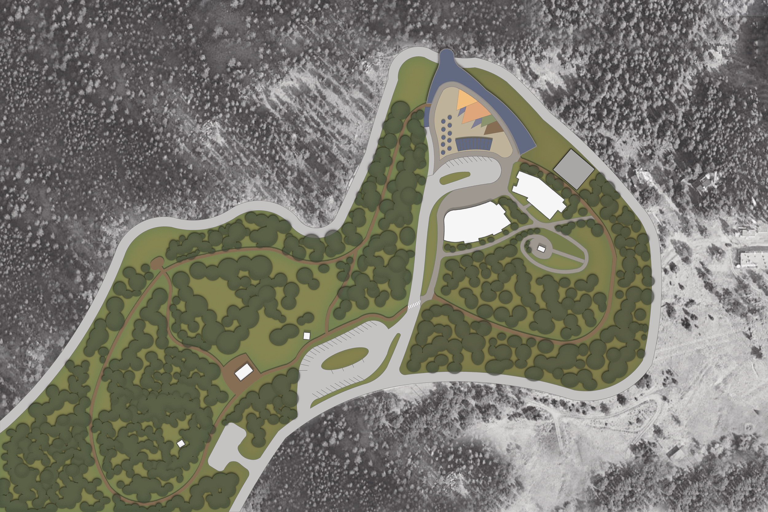 Upon completion of the previously displayed master plan and with feedback from clients at Denver Mountain Parks, this individual project re-imagined the view possibilities of Lookout Mountain. Currently the park maintains one overlook platform facing due East yet the spectacular viewsheds north and west are neglected.